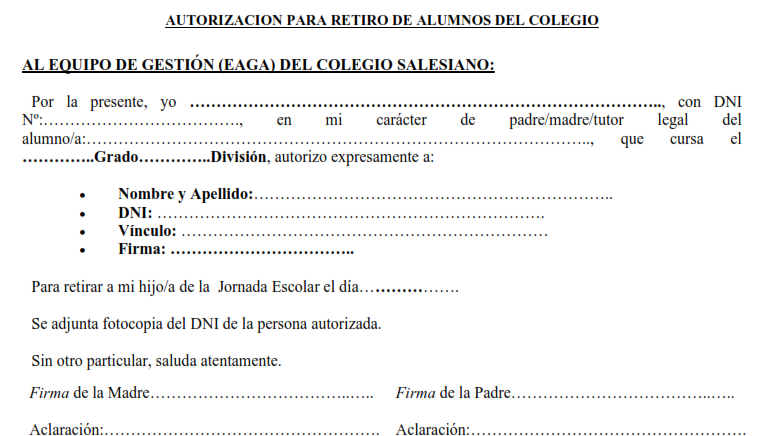 Autorizacion para retiro ALUMNOS del COLEGIO